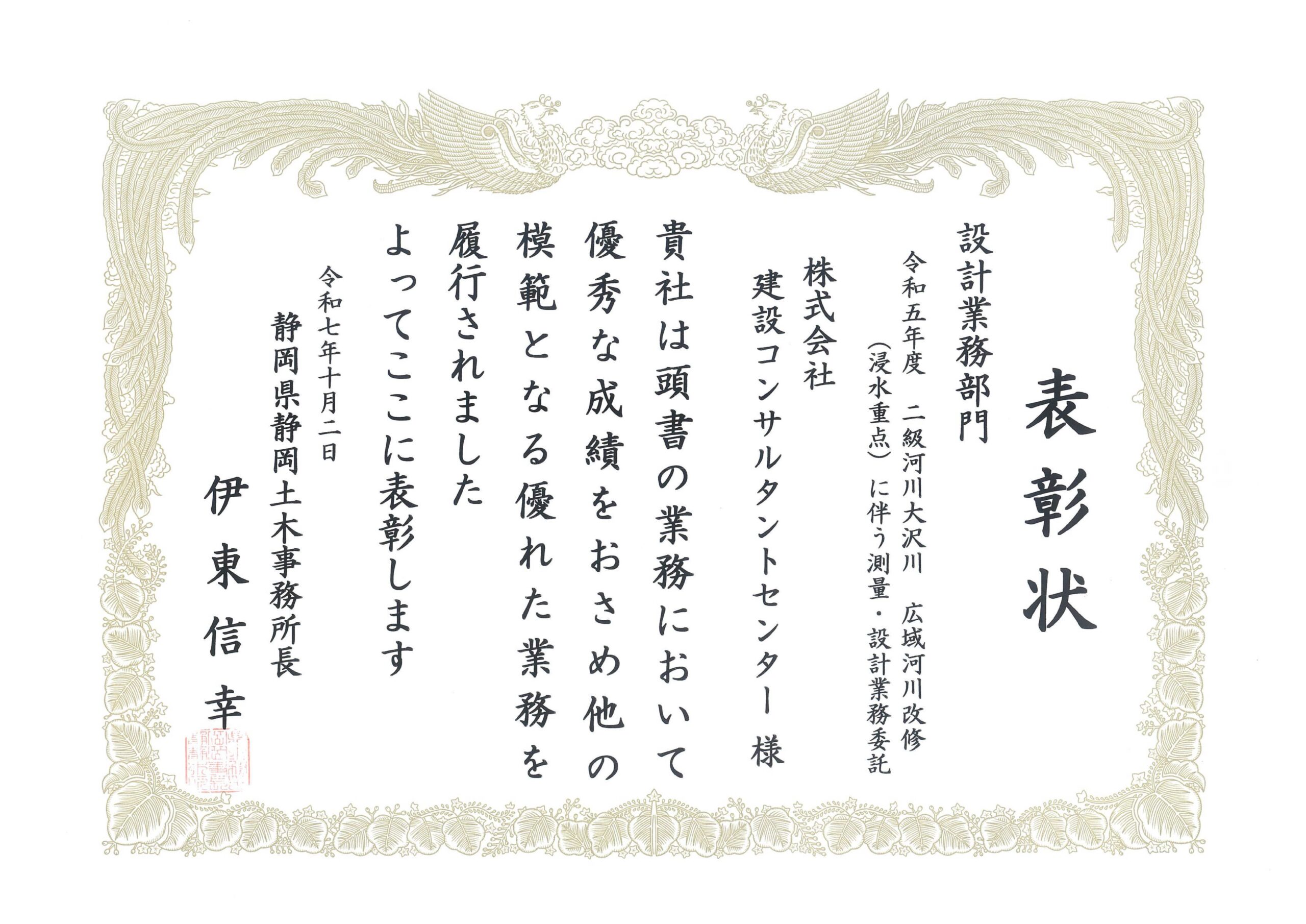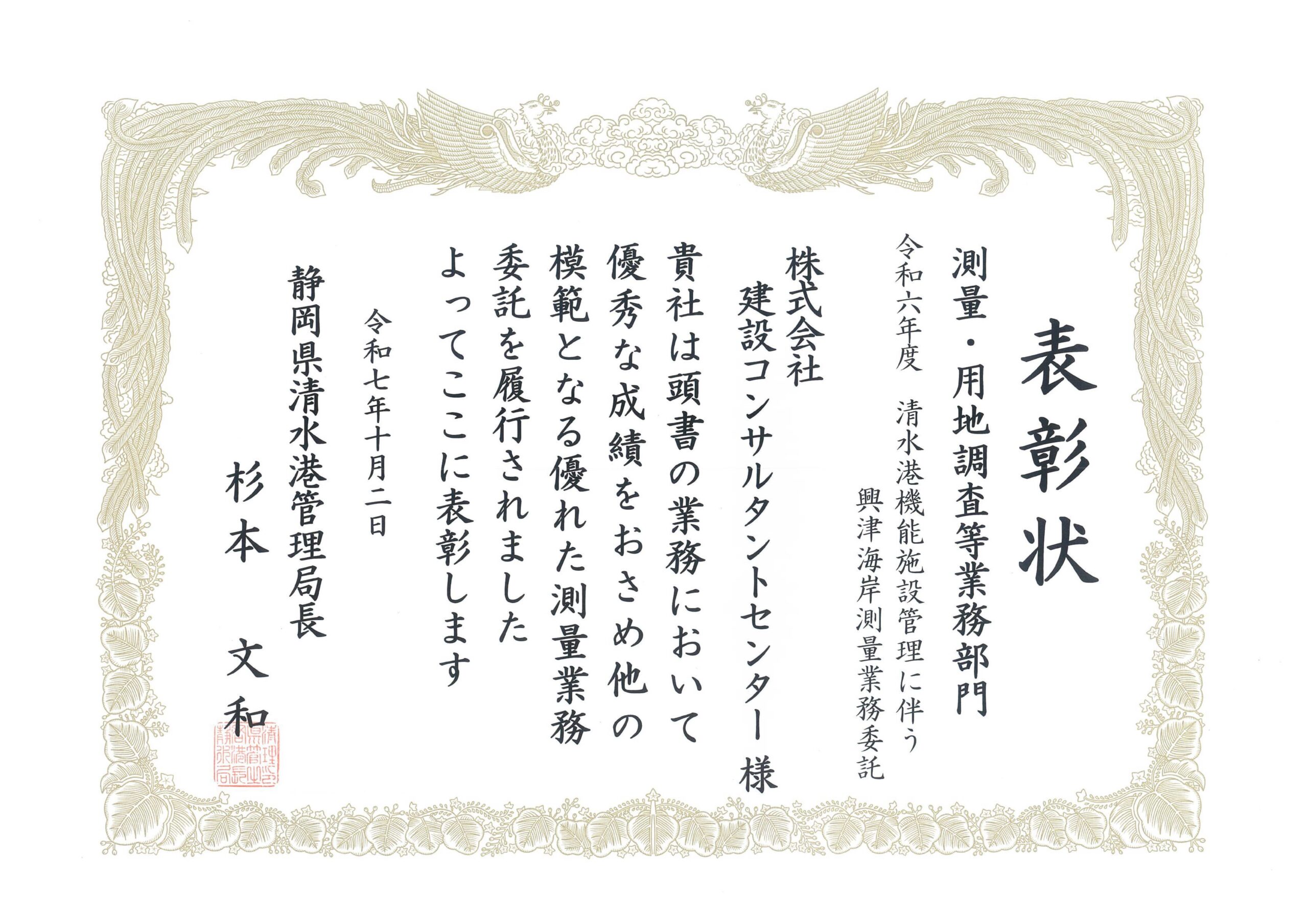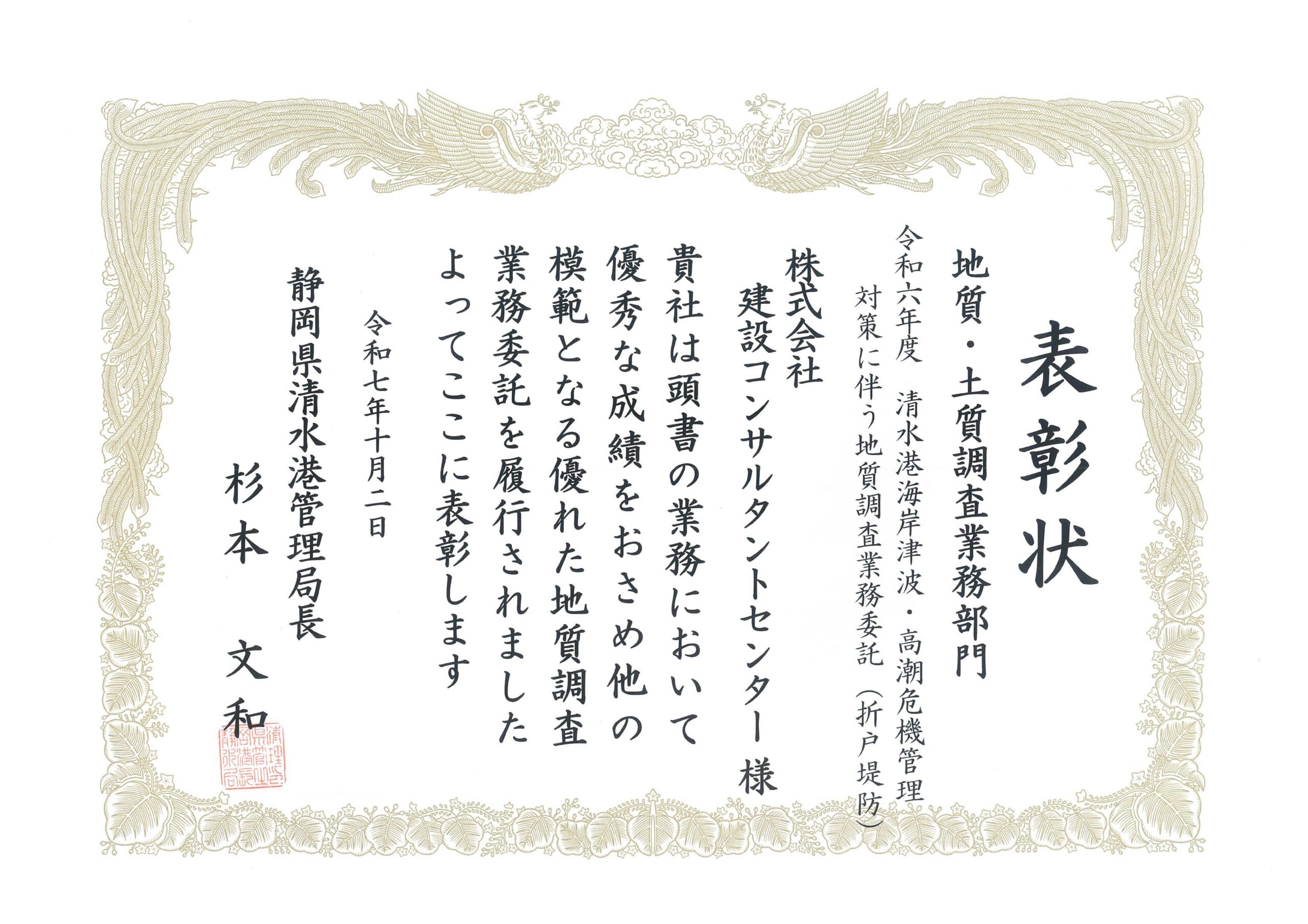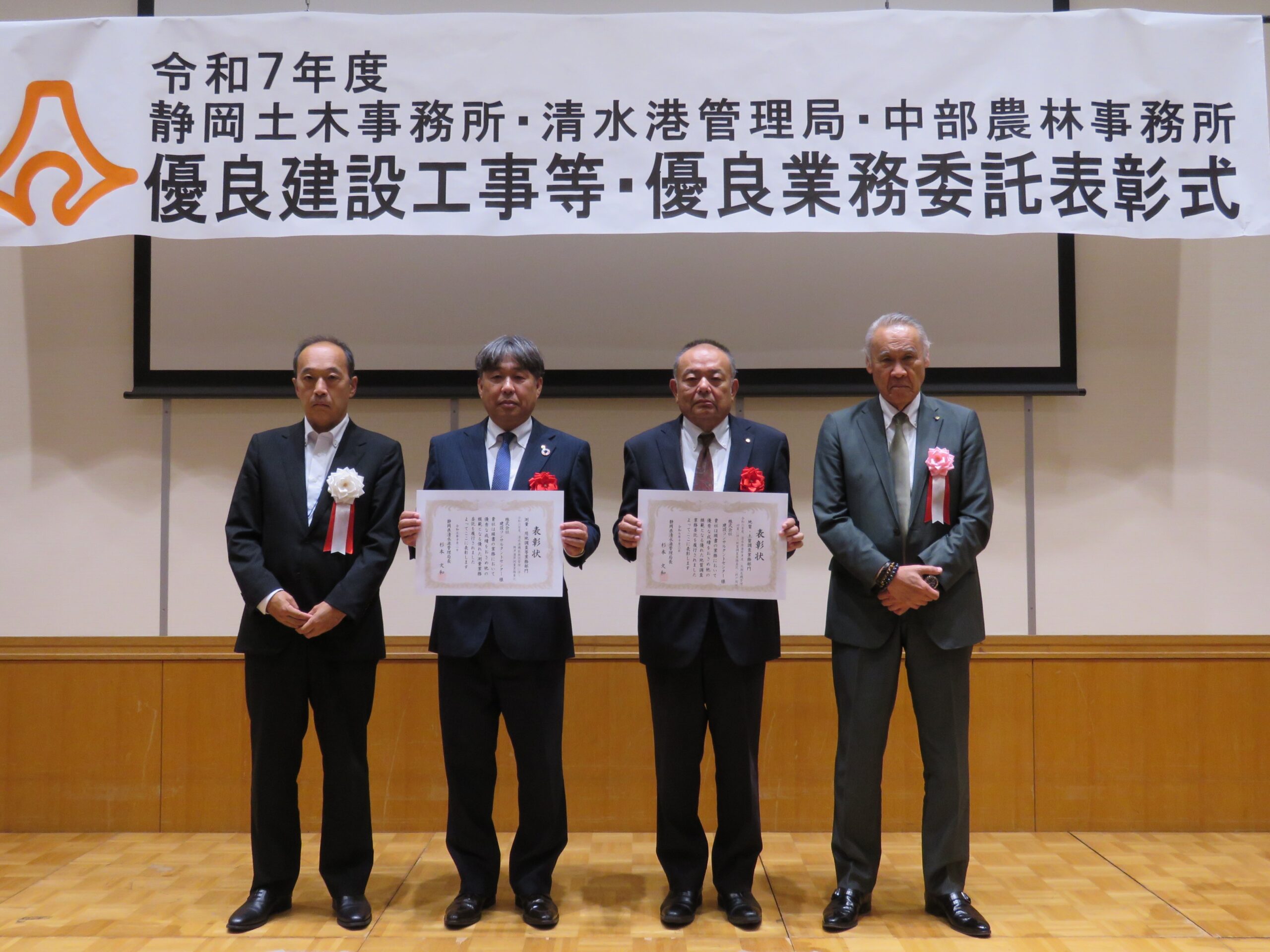 静岡県 静岡土木事務所、清水港管理局 より『令和7年度 優良業務委託表彰』を受賞しました。